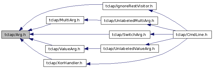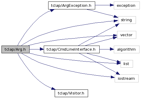 #include <string>#include <vector>#include <list>#include <iostream>#include <tclap/ArgException.h>#include <tclap/Visitor.h>#include <tclap/CmdLineInterface.h>Include dependency graph for Arg.h: