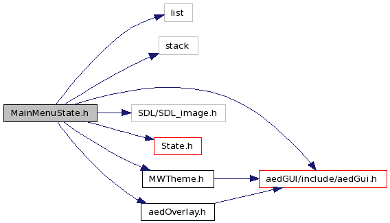 #include <list>#include <stack>#include "aedGUI/include/aedGui.h"#include <SDL/SDL_image.h>#include "State.h"#include "MWTheme.h"#include "aedOverlay.h"Include dependency graph for MainMenuState.h: